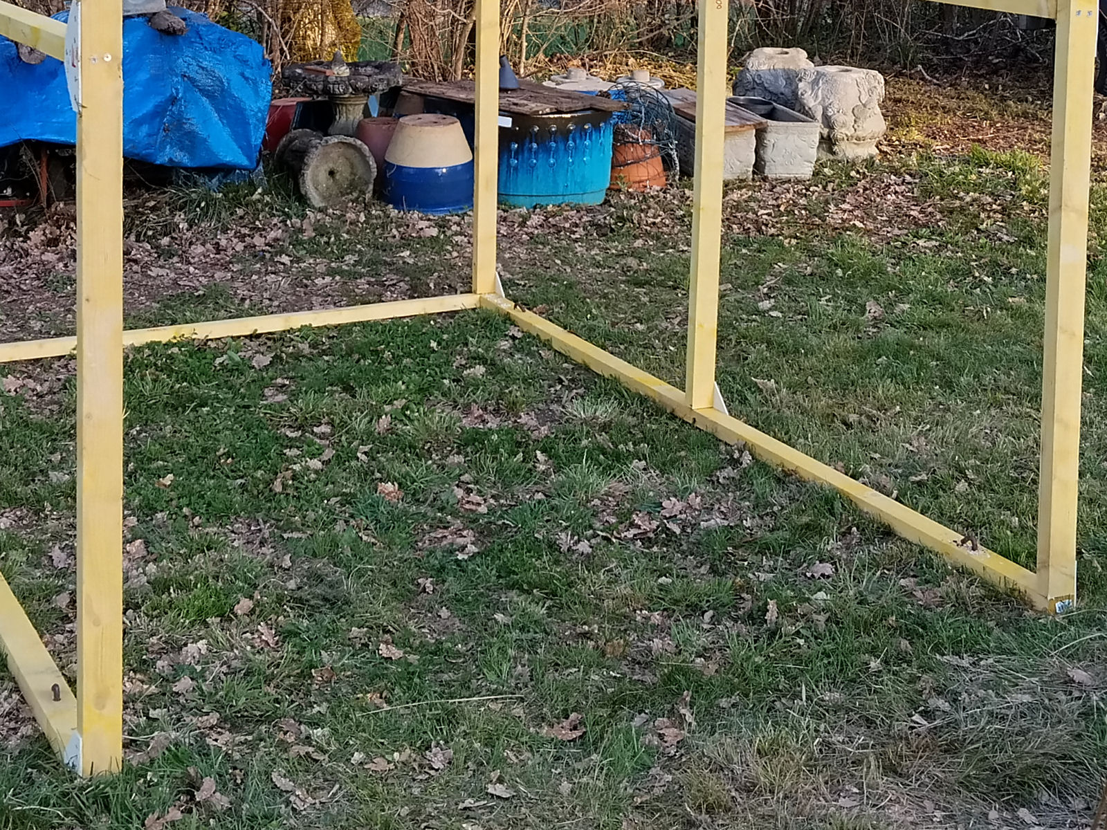 The first job requiring some proper earth moving is the base for my planned garden tool store and workshop. It will measure 4.5 x 3.5 metres and I intend to lay a concrete base 12.5 cm thick which will require about two cubic metres of concrete. I set out the area at the bottom of my garden a week or so ago with red pegs linked by light string and today marked it with fluorescent marker paint as I wanted to remove the pegs and string so I could start work.
