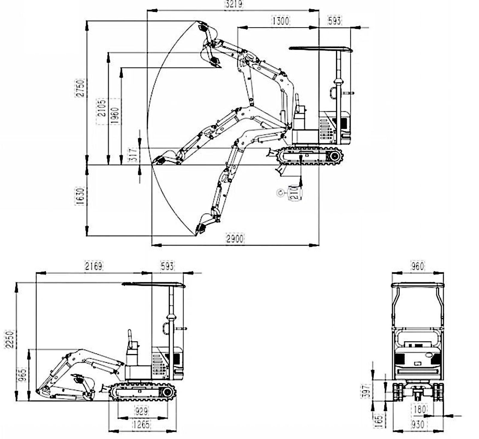 As shown below, the excavator’s dimensions with its boom folded are height 2250 cm, length 1893 cm and width 960 cm.