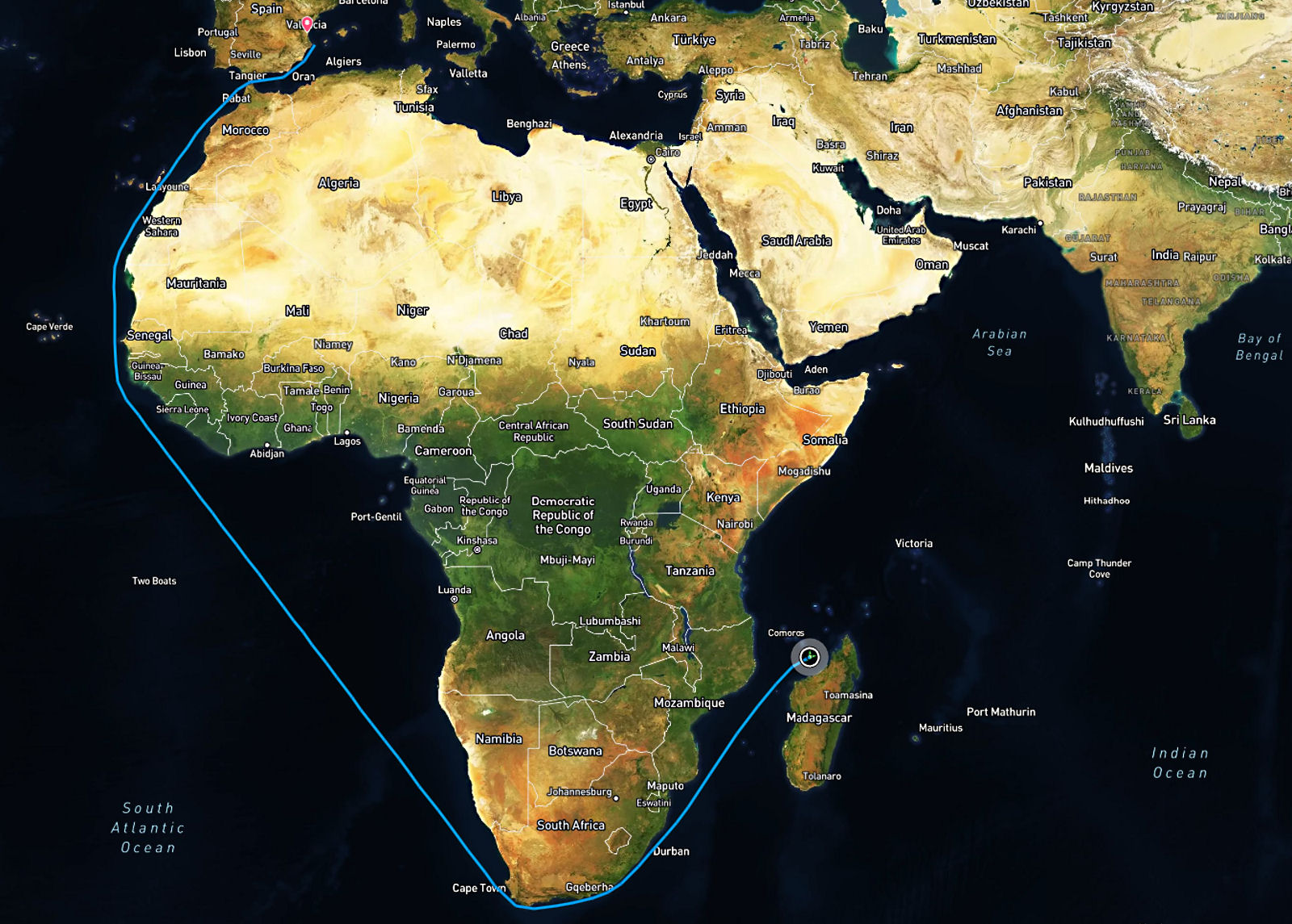 As expected, the CMA CGM CEDRUS, the container ship bringing my mini excavator from China, is now fully committed to routing to Valencia, its next port of call, via the Cape of Good Hope.