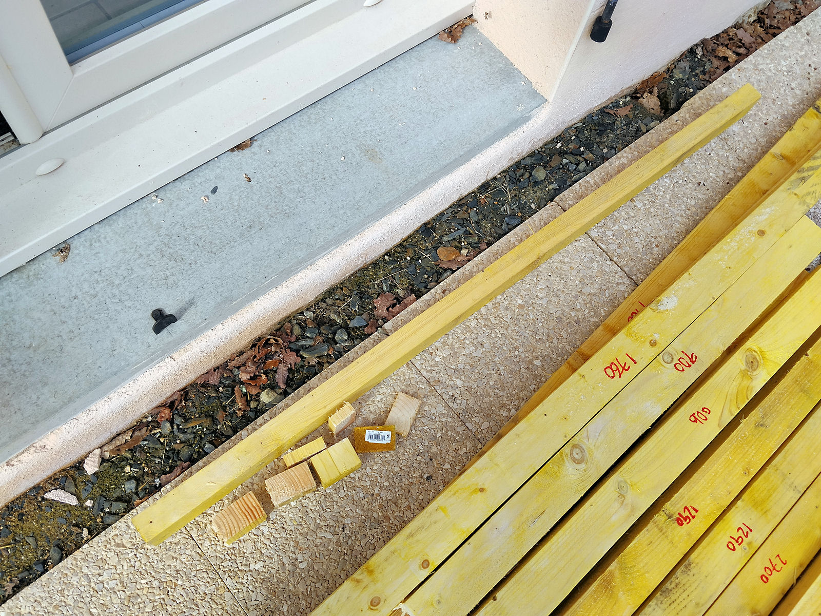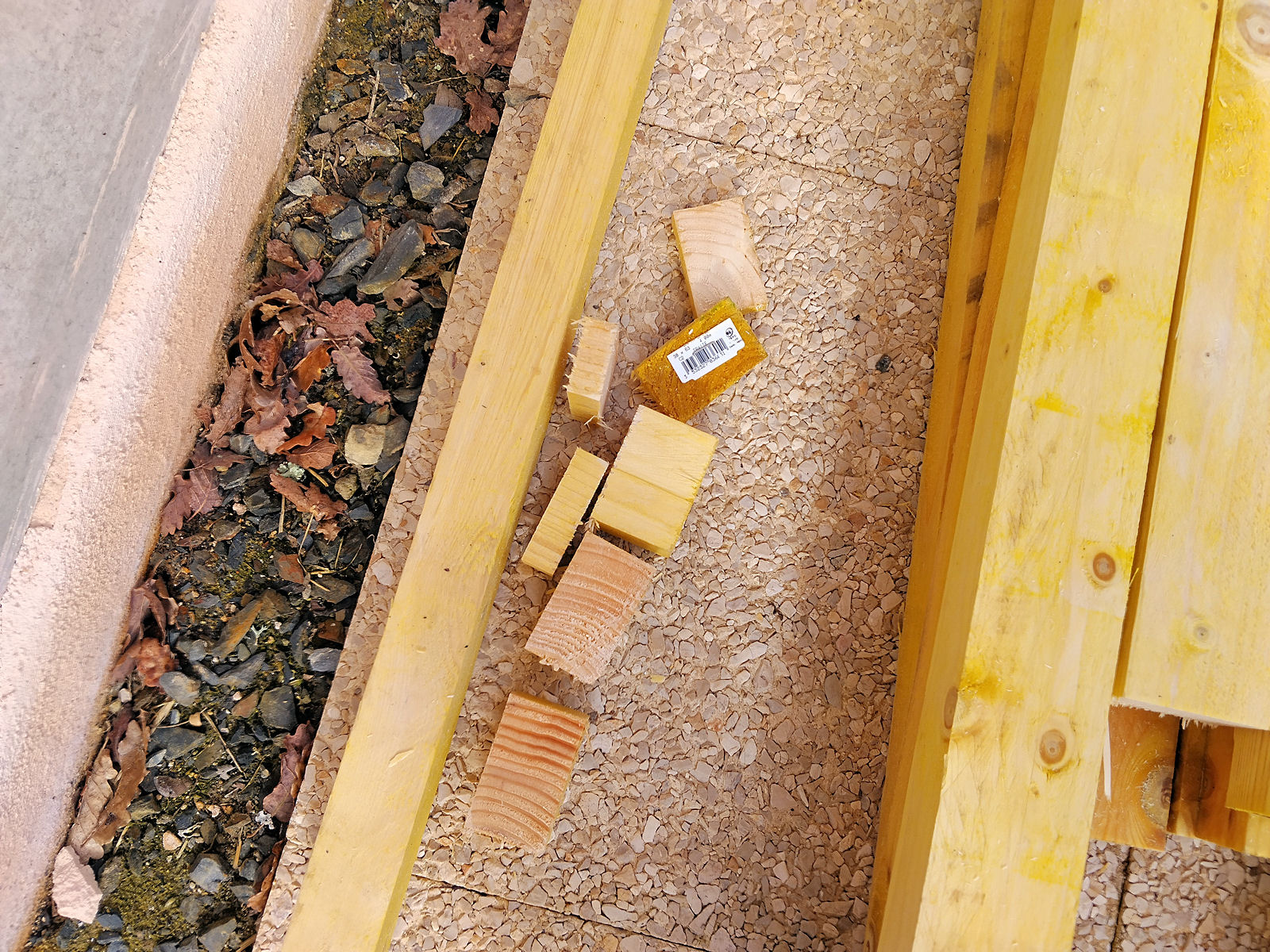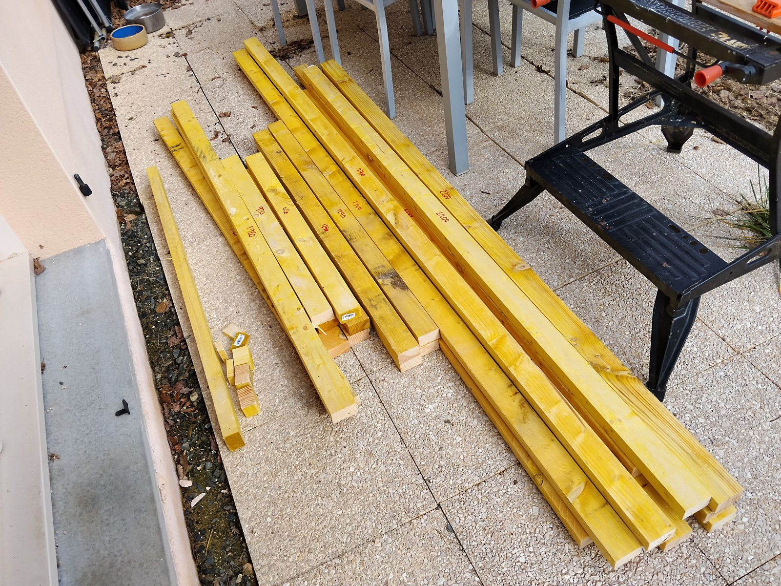 I purchased eleven 4m lengths of ‘demi-chevron’ wood (roughly 60mm x 40mm) from Leroy Merlin the other day from which to build the framework. Unfortunately it was stored in the open in their yard and it’s very wet which doesn’t make it any easier to work – quite the opposite. I’ve actually increased the height of the garage to just over 2.2 metres and it’s length to 2.7 metres which will give a bit more height clearance and a bit more length to cover the excavator’s boom when it has been lowered and this morning I measured and cut all of the components of the framework.