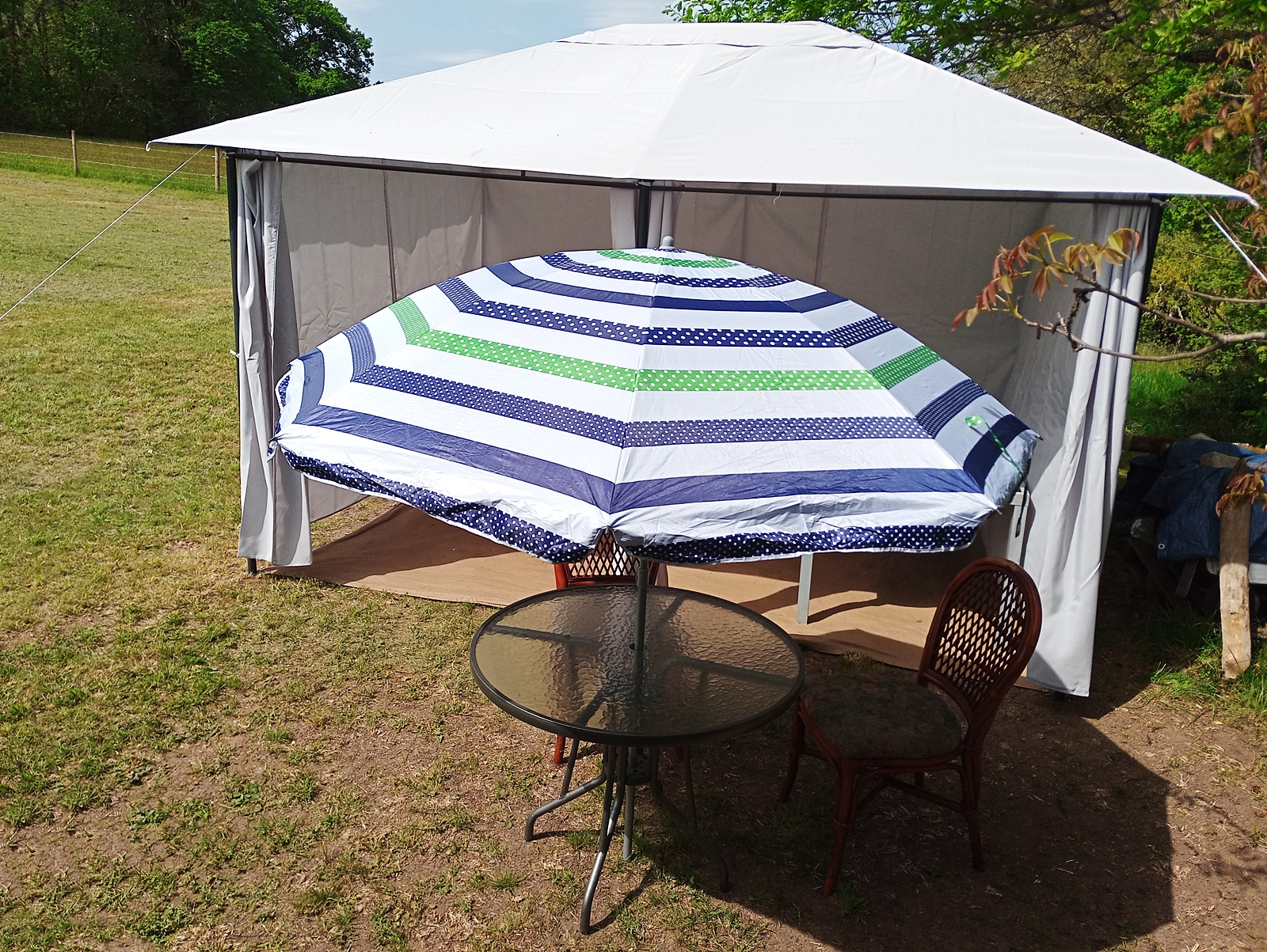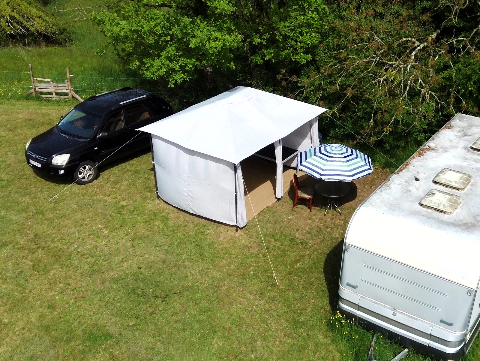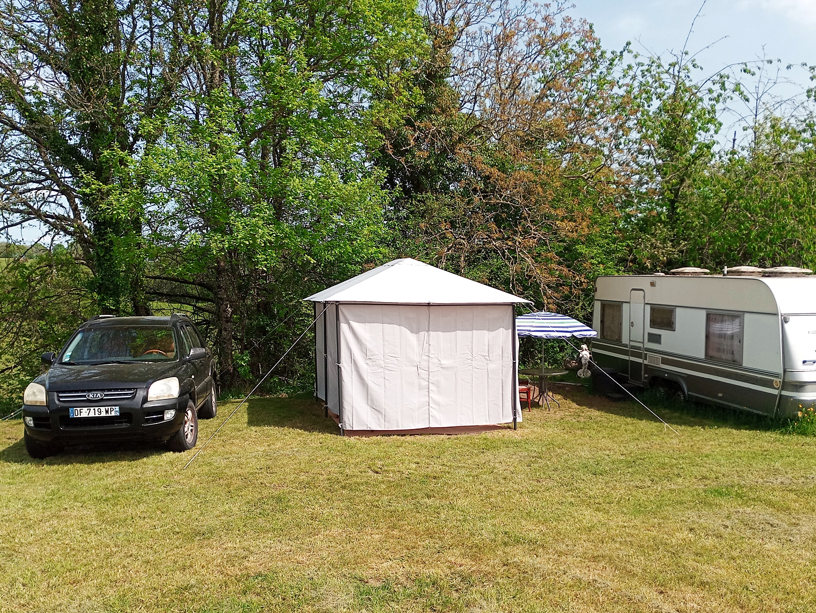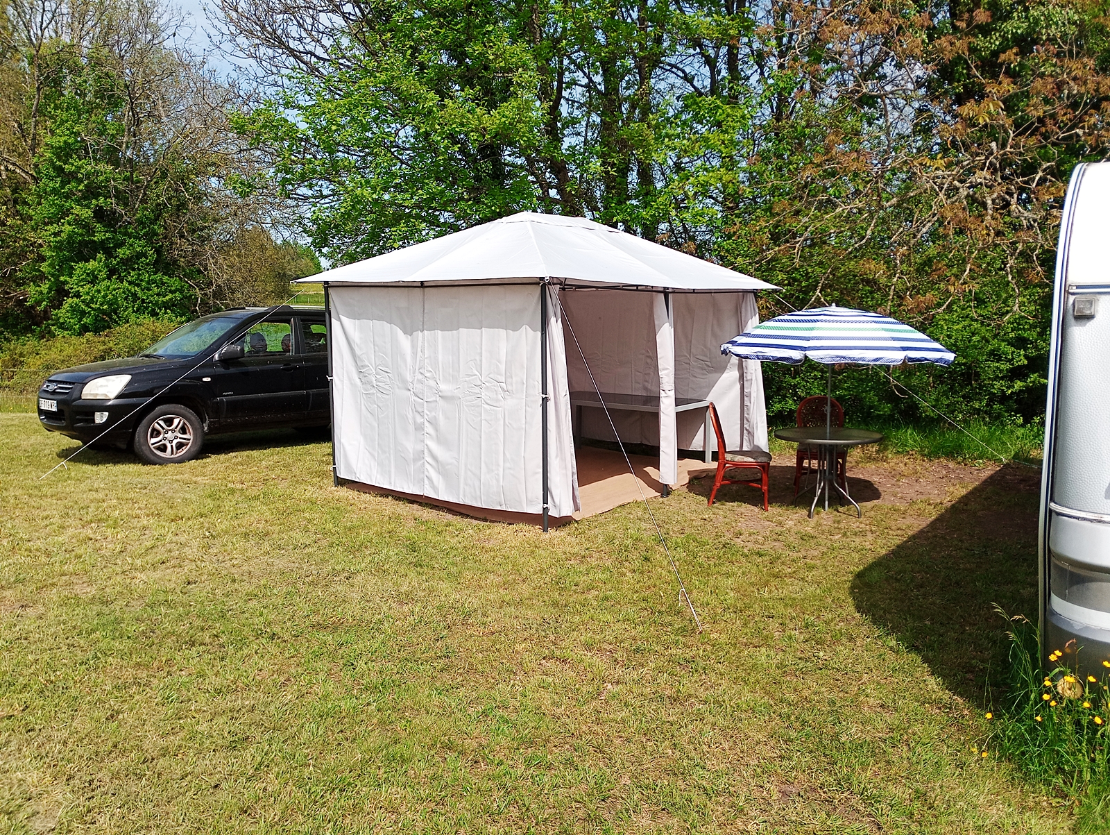But better this time. Having yesterday dismantled the original ‘tonnelle’ that I erected on my land, today it was time to dig the second one out of my ‘abris’ and put that up. Having learned the lessons from last time I was able to modify my approach to minimise the strain imposed on its metal framework and I also moved it very slightly to get a flatter area for it to stand on. It took half a day or possibly a bit more, but I was very pleased with the results and here are some shots that I took at the end of the afternoon, starting with the view from the caravan