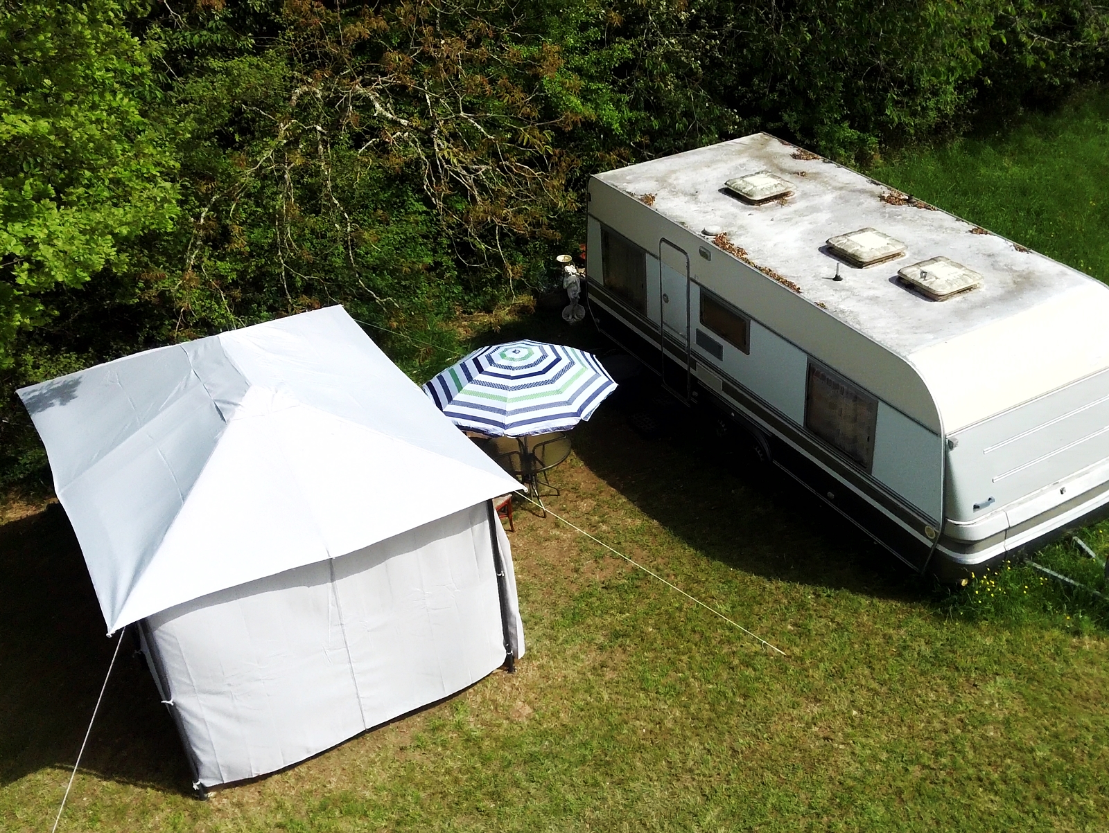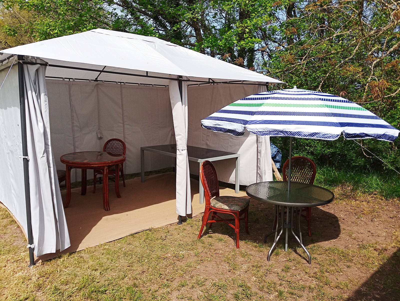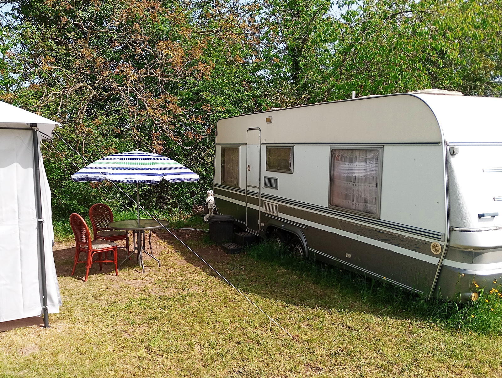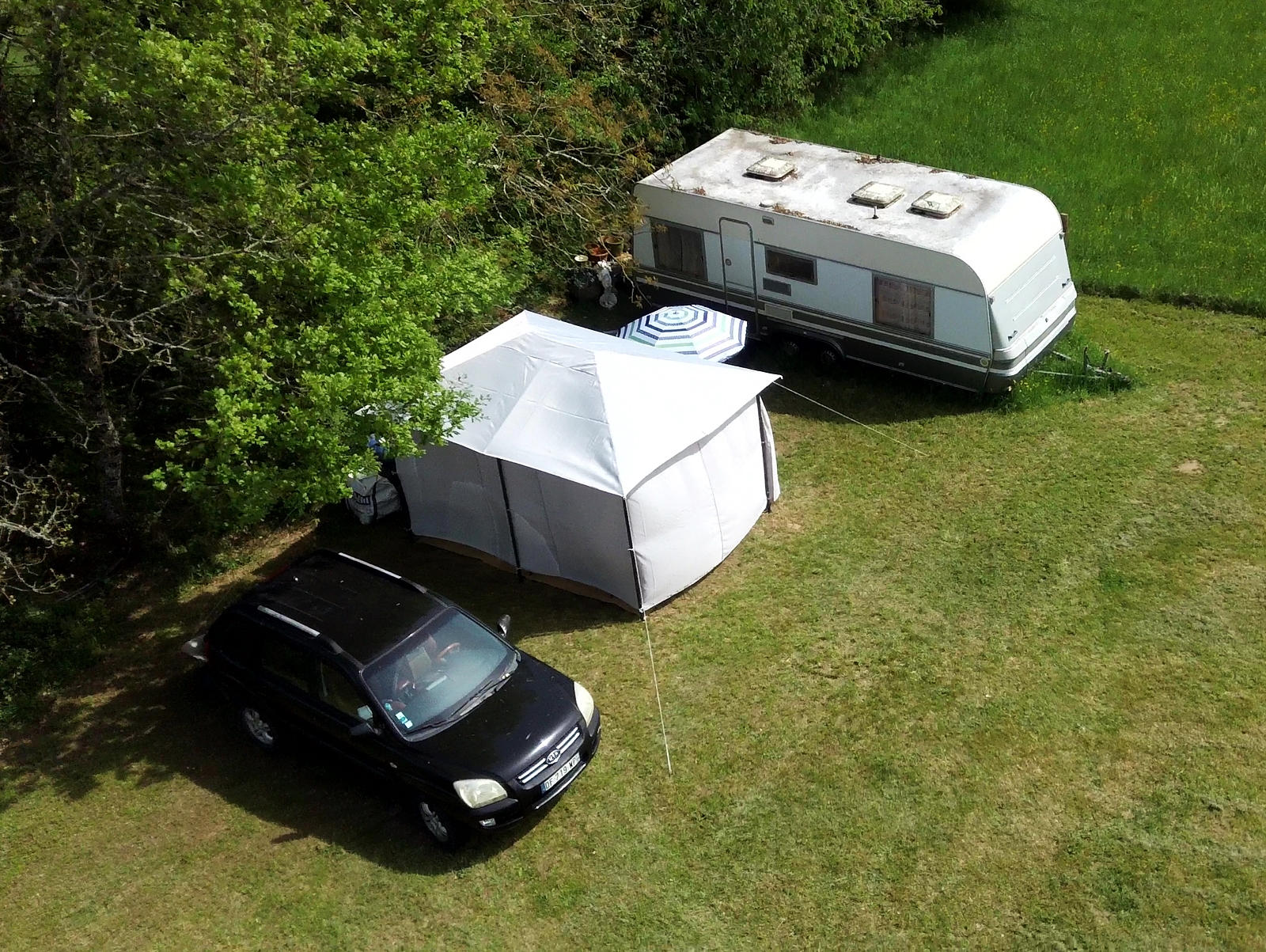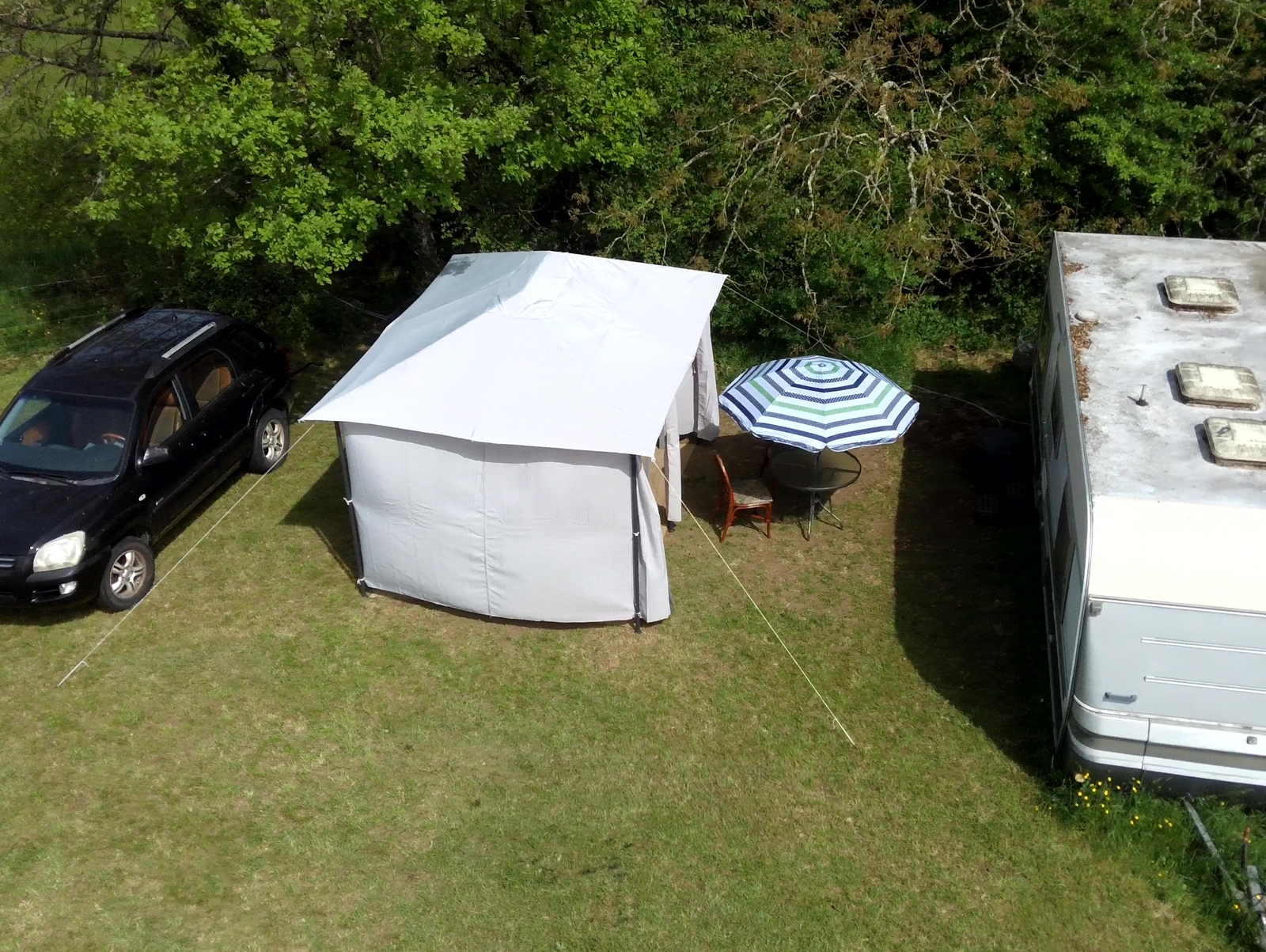 But better this time. Having yesterday dismantled the original ‘tonnelle’ that I erected on my land, today it was time to dig the second one out of my ‘abris’ and put that up. Having learned the lessons from last time I was able to modify my approach to minimise the strain imposed on its metal framework and I also moved it very slightly to get a flatter area for it to stand on. It took half a day or possibly a bit more, but I was very pleased with the results and here are some shots that I took at the end of the afternoon, starting with the view from the caravan